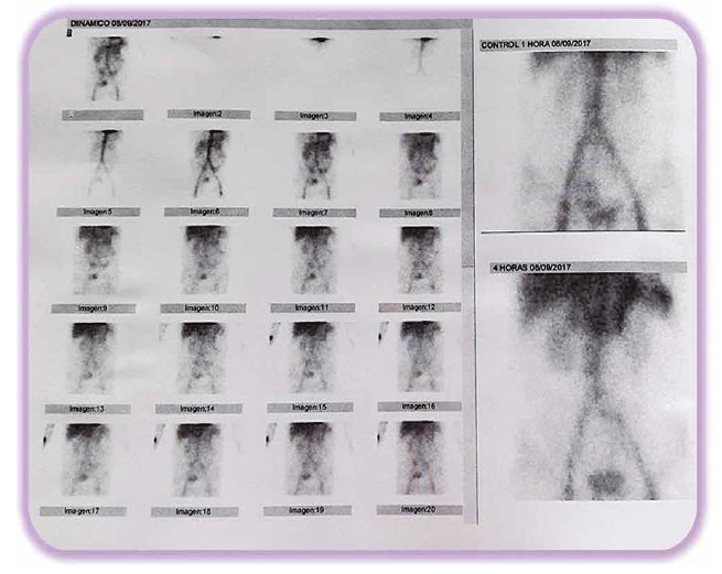 Con base en la sintomatología y los resultados previos se sugiere la impresión diagnóstica de hemorragia digestiva de origen desconocido, a descartar neoplasia maligna versus tumoración vascular. Posteriormente, se realiza un estudio gammagráfico con glóbulos rojos marcados, en el cual se evidencia una captación patológica persistente en hipogastrio, proyectada en región paravesical derecha y adyacente a las asas intestinales descritas, hallazgos que son sugerentes de corresponder a una tumoración vascularizada (Figura 2).