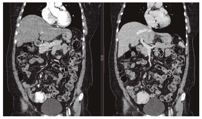 La paciente refiere un tiempo de enfermedad del episodio actual de cuatro días. Presenta dolor abdominal tipo cólico en hemiabdomen inferior de moderada intensidad, melena 1 a 2 veces al día, hematoquezia 3 a 4 veces al día, nausea y astenia. Al examen físico: TA: 100/60mmHg, FC: 98 latidos por minuto, FR: 18 respiraciones por minuto y SaO2: 97%. La paciente estaba despierta, en regular estado general, con palidez +/++++ y tinte ictérico en piel. El abdomen blando, depresible, ruidos hidroaéreos de adecuado tono y frecuencia, con ausencia masas palpables y presencia de leve dolor en hemiabdomen inferior. Se le realizan exámenes auxiliares en los que se halla anemia moderada (con hemoglobina 8,9 mg/dL), discreta leucocitosis sin desviación izquierda (11.030/ml), plaquetopenia leve (144.000/ml), hipoalbuminemia (3,3 mg/dL), hiperbilirrubinemia a predominio indirecto (bilirrubina total 3,5 mg/dL, bilirrubina indirecta 2,6 mg/dL, bilirrubina directa 0,8 mg/dL).