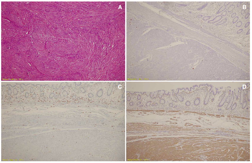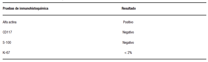 En cuanto a inmunohistoquímica, los leiomiomas muestran casi siempre expresión difusa positiva para los marcadores Alfa actina de musculo liso (SMA), desmina y caldesmon y son negativos para S100, CD34 y CD117.8 En el presente reporte se observó positividad a SMA y resultados negativos para S100 y CD117 (Figura 4). Los otros estudios no fueron explorados.