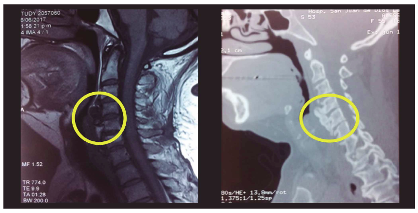 Como antecedentes personales presenta hipotiroidismo tratado y cervicalgias recurrentes producto de osteofitos cervicales. El servicio de neurología solicita una resonancia magnética (RNM) de columna cervical que informa la deshidratación total de los discos cervicales; mínima profusión posterior de los discos C3, C4, C5; protrusión disco-osteofitaria posterior bilateral a nivel C5, C6 y C7 que ocupa espacio epidural anterior; osteofitos marginales que crecen en sentido anterolateral y la médula espinal con morfología y señal normales (Figura 1).