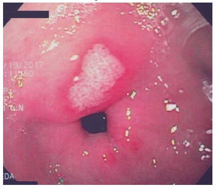 Presentamos a una mujer de 45 años, sin antecedentes de relevancia, a la que se le solicitó una endoscopía digestiva alta por dispepsia de 6 meses de evolución. El examen físico, el laboratorio de rutina y la ecografía abdominal no informaron alteraciones. Durante la endoscopía, se observó en el antro una lesión plana blanquecina de aproximadamente 1,5 cm de diámetro, con reborde congestivo que se biopsió (Figura 1) y se tomaron muestras de antro y cuerpo para la búsqueda de Helicobacter pylori.