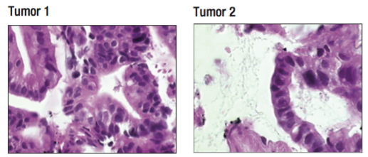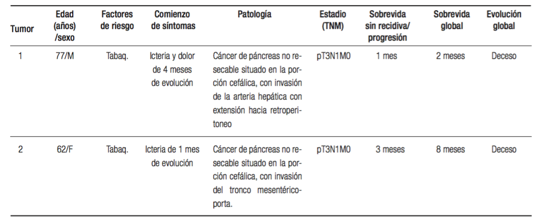 En la Tabla 1 se detallan las características de los pacientes y la evolución del tumor. La Figura 1 muestra la histología de los tumores. El tumor 1 presentó una diferenciación glandular y algunas formas tubulares. En la foto del tumor 2 observamos un estroma desmoplásmico y formaciones glandulares.