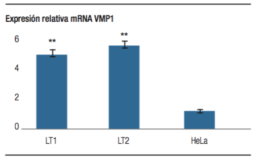 Con el objetivo de evaluar la expresión de VMP1 en las líneas celulares establecidas a partir de muestras humanas, se determinó la expresión del mRNA de VMP1 en las líneas tumorales y se la comparó con la expresión en células HeLa utilizando la técnica de RT-PCR Real Time. Como control interno se amplificó la b-actina. Los niveles de mRNA de VMP1 fueron relativizados al mRNA de b-actina. Los resultados mostraron que la expresión basal del mRNA de VMP1 de las células tumorales pancreáticas es significativamente mayor que el de las células HeLa (Figura 2). Estos resultados sugieren que las células primarias de cáncer pancreático podrían presentar mayores niveles de autofagia, indicados por una mayor expresión de la proteína VMP1.