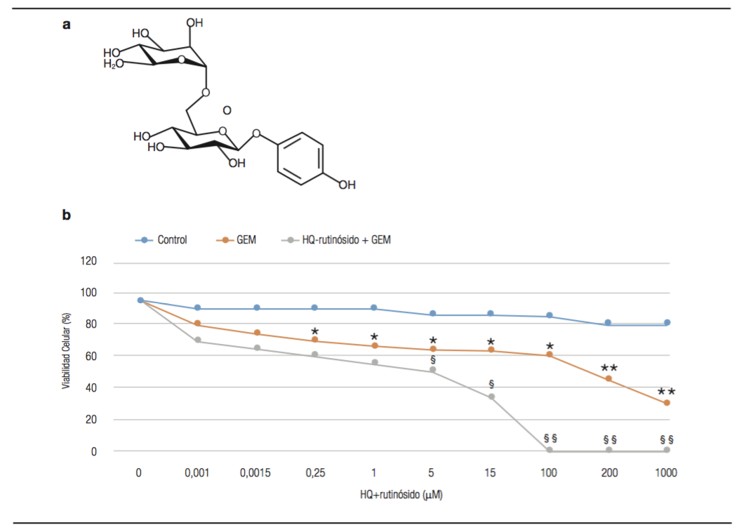 Se analizó la sensibilidad de las células de cáncer pancreático primarias al tratamiento con gemcitabina. Las líneas celulares primarias fueron tratadas con 200 μM de gemcitabina. Luego de 4 horas, se adicionaron de 0 a 1000 μM de HQ-rutinósido y a las 24 h se evaluó la citotoxicidad y se determinó el porcentaje de células viables. En la Figura 3A se detalla la estructura química de la HQ-rutinósido sintetizada enzimáticamente. Luego del tratamiento con HQ-rutinósido por 24 h, observamos que la administración de 15 μM HQ-rutinósido combinado con 10 μM gemcitabina afectó significativamente la sobrevida celular comparada con el tratamiento con gemcitabina únicamente. Podemos concluir que el efecto citotóxico de un glicocompuesto como segunda línea de terapia a la gemcitabina mejora significativamente la efectividad del tratamiento contra el PDAC.