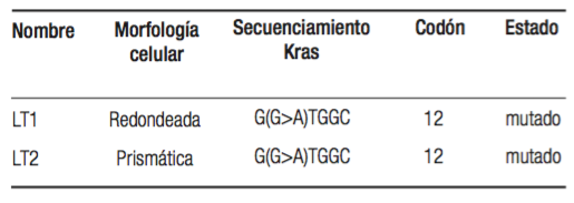Con el fin de corroborar la tumorigenicidad de las líneas celulares primarias, realizamos la caracterización del estado mutacional de Kras por PCR (121). Los resultados de PCR fueron seguidos por la secuenciación del ADN. Ha sido previamente publicado que la mutación de Kras se encuentra entre el 75-95% de los adenocarcinomas pancreáticos. Las líneas celulares estudiadas portaron la mutación Kras, en el cromosoma 12, exón 1 a nivel de los codones 12 (mutación más frecuente). Las formas mutadas contienen GAT (ácido aspártico) y GTT (valina) (Tabla 2). La presencia de estas mutaciones en las líneas celulares establecidas indica el origen epitelial de un proceso tumoral pancreático.