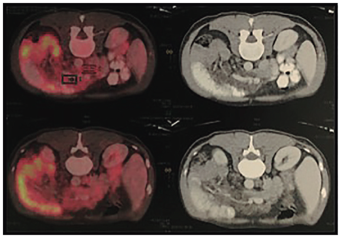 Con base en dichos hallazgos se procede a la realización de una tomografía por emisión de positrones (PET-TC) que evidencia una marcada alteración de la densidad de la grasa intraabdominal asociada a numerosas formaciones ganglionares, algunas de ellas con escasa actividad metabólica con SUV (standardized uptake value) de 3,5 a 6,5 (Figura 1).