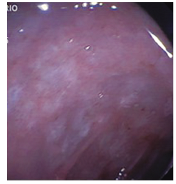 Debido a los hallazgos no concluyentes se decide repetir la videoendoscopía digestiva alta. En esta ocasión se informa que tras progresarse hasta la cuarta porción del duodeno se observan pliegues engrosados, mucosa eritematosa y friable, recubierta por placas blanco-amarillentas, tomándose múltiples biopsias (cinco) (Figuras 3 y 4).