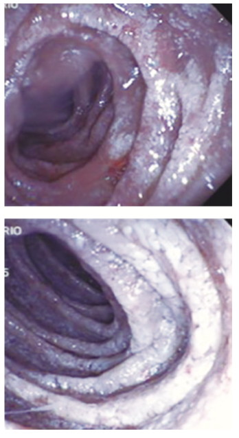En el estudio endoscópico del tubo digestivo puede visualizarse en la región posbulbar del duodeno y a nivel del yeyuno una mucosa pálida y despulida alternando con zonas erosionadas, eritematosas o friables. Puede presentar además linfangiectasia, que torna la mucosa de color amarillo pálido.29, 30 En la segunda endoscopía se visualizó una mucosa eritematosa y friable, recubierta por placas blanco-amarillenta.