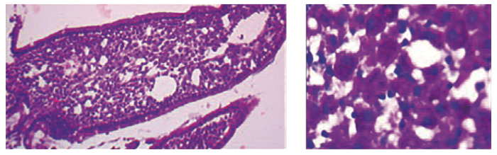 Ulteriormente se decide la exploración quirúrgica por laparotomía, en la cual no se observan lesiones intestinales en la macroscopía y se visualizan múltiples adenomegalias en el mesenterio, predominantemente en el área yeyunal. Se realiza una biopsia y el examen anátomo-patológico descarta por microscopía e inmunohistoquímica una enfermedad linfoproliferativa primaria, y evidencia una expresión linfocitaria policlonal, con presencia de plasmocitos reactivos, compatible con cuadro reactivo/inflamatorio, de carácter inespecífico (Figura 2).