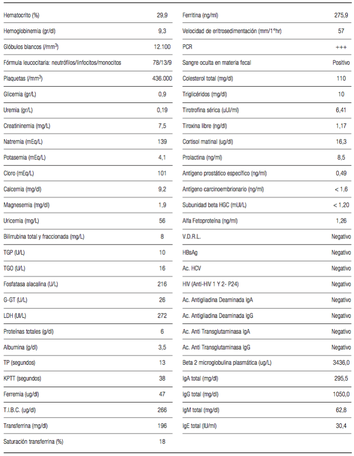 Los hallazgos analíticos son completamente inespecíficos, puede cursar con niveles elevados de reactantes de fase aguda, anemia, leucocitosis, trombocitosis y signos bioquímicos de malaabsorción. Menos frecuentemente puede existir trombocitopenia y eosinofilia.1, 2, 3, 4 El caso comunicado presentó anemia microcítica, hipocrómica, leucocitosis neutrofílica y velocidad de eritrosedimentación globular elevada.
