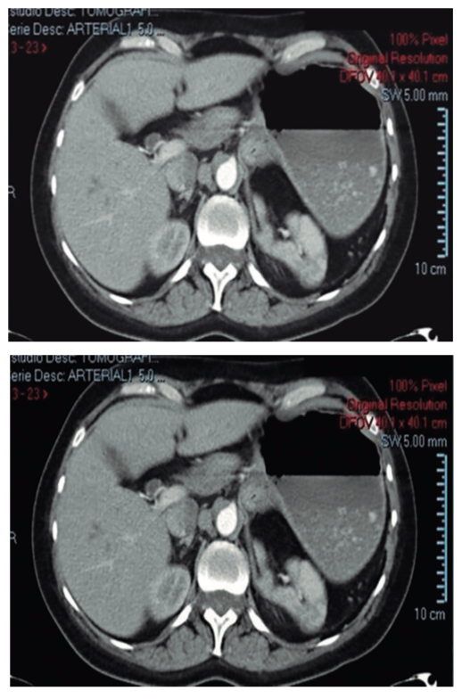 El paciente ingresa por emergencia con un tiempo de enfermedad de 8 días caracterizado por deposiciones liquidas, sin moco ni sangre, 5 días antes se agrega dolor abdominal tipo cólico en flanco izquierdo y 3 días antes presentó vómitos. Se hospitaliza con sospecha de una intoxicación alimentaria, por lo que se administra hidratación intravenosa y antibióticos. Al día siguiente presentó distensión abdominal progresiva y, a los 2 días además de aumento de la distensión se agrega descenso de la Hb de 10 g/dL a 7g /dL; se trasfundió con 3 paquetes globulares, y se solicitó una tomografía espiral multicorte (TEM) de abdomen en la cual se observaron signos de vólvulo gástrico de tipo mesentérico axial asociado a escaso líquido laminar libre (Figuras 1 y 2).