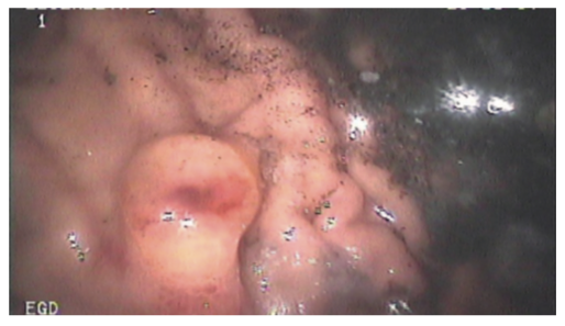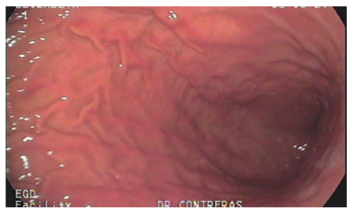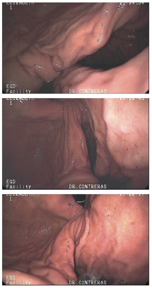 Posterior al resultado de la TEM abdominal, se le coloca una sonda nasogástrica a gravedad y se le realiza una VEDA de urgencia para evaluación y posible devolvulación endoscópica. Durante la VEDA, se encuentra en cuerpo la torsión de la cámara gástrica sobre su eje que no permite el paso del equipo a segmentos más distales formando un loop marcado, por lo que se cambia de posición a la paciente y se progresa hasta la región antral con mucha dificultad (Figuras 3, 4, 5); al no encontrarse signos de isquemia de la mucosa, se traspone el píloro y se logra progresar hasta la segunda porción duodenal en donde se realiza una maniobra de remangue. Se evalúa nuevamente el cuerpo gástrico donde se evidencia la mucosa levemente eritematosa con distensibilidad adecuada de sus paredes y distribución adecuada de sus pliegues pos devolvulación (Figura 6).