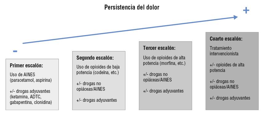 La OMS ha desarrollado la escalera analgésica para los pacientes con dolor oncológico, que se ha adaptado al manejo del dolor agudo y crónico no oncológico con el transcurso del tiempo (Figura 1).