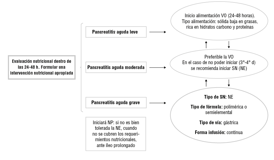 Abstract: Acute pancreatitis (AP) is an inflammatory condition of pancreas that can cause local injury, systemic inflammatory response syndrome, organ failure and death. It is one of the gastrointestinal pathologies that most commonly require hospitalization. Its management has changed in recent years due to a better understanding of its pathophysiology, the evolution of the therapeutic arsenal, advances in nutritional support, the correct use of antibiotics and improvements in minimally invasive techniques for the treatment of local complications. The medical societies carry out multidisciplinary and standardized treatment guidelines that do not have clinical repercussions, since the degree of international compliance of them is scarce. This report focuses on ten important measures for the initial management (within 72 hours) of the PA, a period in which decision-making can alter the course of the disease and the length of hospitalization. Each section of this document presents key recommendations linked to each topic, followed by a summary of recommendations.