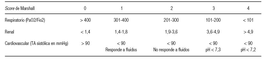 Los principales determinantes de mortalidad en el curso de una PA son el fallo persistente de órgano (FOP) durante la primera semana, y la necrosis pancreática infectada (NPI), pasados los 5-7 días del inicio del cuadro.35,36 El FOP se define como aquel que se prolonga por más de 48 horas con compromiso de alguno de los siguientes parámetros: PaO2/Fio2, creatininemia, tensión arterial (score de Marshall).37 Un score de 2 o más puntos en cualquier órgano implica la presencia de fallo de órgano (Tabla 1).
