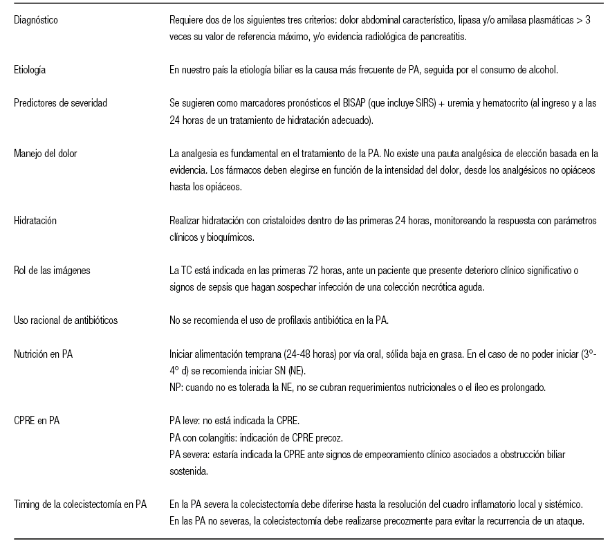 Resumen: La pancreatitis aguda (PA) es una condición inflamatoria del páncreas que puede causar injuria local, síndrome de respuesta inflamatoria sistémica, fallo orgánico y muerte. Es una de las patologías gastrointestinales que más comúnmente requieren hospitalización. Su manejo ha cambiado en los últimos años debido a una mejor comprensión de su fisiopatología, la evolución del arsenal terapéutico, los avances en el soporte nutricional, la correcta utilización de los antibióticos y las mejoras en las técnicas miniinvasivas para el tratamiento de las complicaciones locales. Las sociedades médicas realizan guías de tratamiento multidisciplinario y estandarizado que no llegan a tener repercusión clínica, ya que el grado de cumplimiento internacional de ellas es escaso. Este reporte está focalizado en diez medidas trascendentes para el manejo inicial (dentro de las 72 horas) de la PA, período en el cual la toma de decisiones puede alterar el curso de la enfermedad y la duración de la hospitalización. Cada sección de este documento presenta recomendaciones claves vinculadas a cada tópico, seguido de un resumen de recomendaciones.
