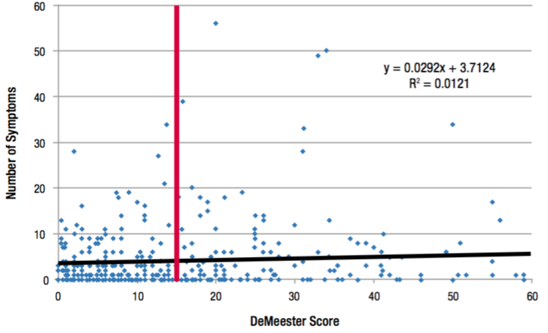 Symptoms and DeMeester score did not correlate for the total number of symptoms (p = 0.8), esophageal symptoms (p = 0.7), extraesophageal symptoms (p= 1.0) and symptom index (p = 0.8) (Figure 1).
