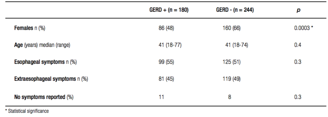 GERD + comprised 44% of the total number of patients studied. Demographic data analysis is shown in Table 1. GERD - patients had a higher proportion of females. Symptoms characteristics were not different when groups were compared.