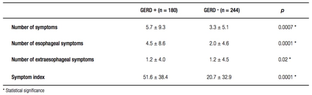 Total number of symptoms, number of esophageal and extraesophageal symptoms, and symptom index were higher in GERD + patients. (Table 2)
