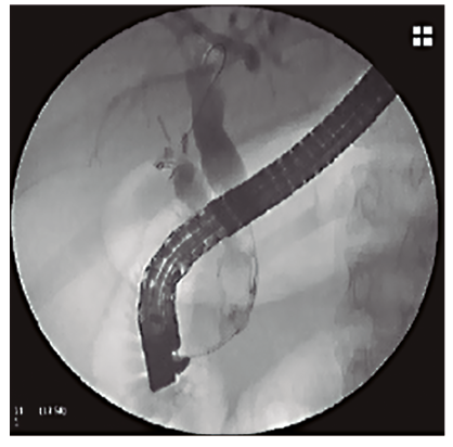 Se trata de una paciente de 47 años, con antecedente de colecistectomía laparoscópica dos años antes y posterior CPRE por litiasis residual, que ingresó por un cuadro de síndrome coledociano. Al ingreso presentaba ictericia cutáneo-mucosa asociada a dolor abdominal leve en la región epigástrica, sin signos clínicos de colangitis. Los datos de laboratorio arrojaron los siguientes resultados: hematocrito 42%, hemoglobina 14,1 g%, glóbulos blancos 7.100/mm3, bilirrubina total: 5,4 mg%, bilirrubina directa: 4,5 mg%, fosfatasa alcalina: 404 U/l, TGP: 223 U/l y TGO: 99 U/l. La colangiorresonancia magnética (CRM) mostró una dilatación de la vía biliar extrahepática con una imagen de defecto de señal en el colédoco distal, compatible con litiasis coledociana. Debido al hallazgo se decidió realizar una CPRE. En el procedimiento se identificó la papila con signos de papilotomía previa, se canuló la vía biliar con papilótomo y alambre guía. Con la colangiografía se evidenció una vía biliar extrahepática dilatada, de aproximadamente 13 mm, y una imagen negativa de 13 mm de diámetro en el colédoco distal. Debido a que la papila no presentaba mayor margen de corte, se decidió realizar una dilatación papilar con un balón tipo CRE de 10 mm. Posteriormente se logró la extracción del cálculo y de barro biliar con un balón extractor (Figura 1).