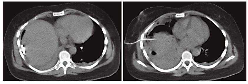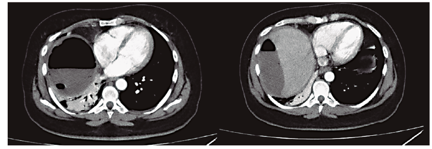 Con este hallazgo se decidió realizar el drenaje percutáneo de dicha colección bajo guía ecográfica, con la colocación de un catéter multipropósito de 12 Fr, lográndose evacuar 400 ml de líquido hematopurulento, cuyo cultivo fue positivo para Escherichia coli sensible. A las 24 horas, debido a que la paciente continuaba con sintomatología respiratoria, se realizó una nueva TC que evidenció una disminución marcada del componente líquido de la colección, persistencia de la imagen con contenido aéreo en contacto con la cúpula diafragmática y el agregado de un derrame pleural homolateral. Se decidió realizar el drenaje percutáneo guiado por tomografía de la colección residual subfrénica y la punción del derrame pleural, cuyo resultado fue interpretado como un empiema debido al examen físico-químico (aspecto turbio, ácido láctico 20 mg%, LDH 4.431 UI/l, glucosa 11 mg% y cultivo positivo para Escherichia coli sensible (Figuras 4 y 5). El empiema pleural fue manejado inicialmente con un tubo de avenamiento derecho, y posteriormente, dado que no se logró el drenaje completo y se observó un peel pleural, se realizó una decorticación por toracotomía con resolución completa de la patología pleural. La paciente evolucionó favorablemente con seguimiento ambulatorio. El hematoma se resolvió completamente y el drenaje se retiró a los 46 días (Figura 6).