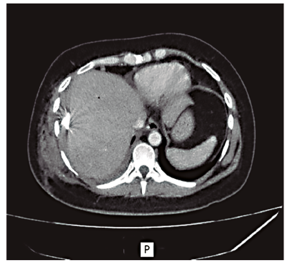 La paciente evolucionó con dolor abdominal leve en el epigastrio que mejoró con analgesia y amilasa post CPRE de 35 UI/l, por lo que se inició la alimentación y se le dio el alta 24 horas después del procedimiento. A las 96 horas reingresó por dolor abdominal severo a predominio del hemiabdomen superior, asociado a disnea clase funcional IV y dolor tipo puntada de costado. Negaba registros o equivalentes febriles y se encontraba hemodinámicamente estable. Laboratorio: hematocrito 39%, hemoglobina 12,7 g%, glóbulos blancos 18.100/mm3, amilasa 42 UI/l, lipasa 49,5 UI/l y hepatograma sin alteraciones. Se realizó una tomografía computada (TC) de abdomen y pelvis con contraste endovenoso, en la que se observó una colección hepática subfrénica derecha de 135 x 75 mm, con contenido particulado y burbujas aéreas, que elevaba la cúpula diafragmática e impresionaba de contenido hemático. Las vías biliares no estaban dilatadas (Figuras 2 y 3).
