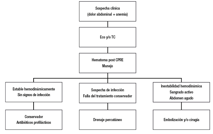 Concluimos que el hematoma hepático post CPRE es una rara complicación del procedimiento, escasamente reportada y quizás subdiagnosticada debido a la variabilidad en su presentación. Dado que es una complicación que puede poner en peligro la vida del paciente, es importante la sospecha clínica ante el hallazgo de dolor abdominal súbito y caída del hematocrito. El manejo depende fundamentalmente de la clínica y el estado hemodinámico, optándose con mayor frecuencia por el tratamiento conservador, pero pudiendo requerir tratamientos más invasivos como el drenaje percutáneo del hematoma, la embolización en caso de sangrado activo o incluso la cirugía en pacientes severamente comprometidos.