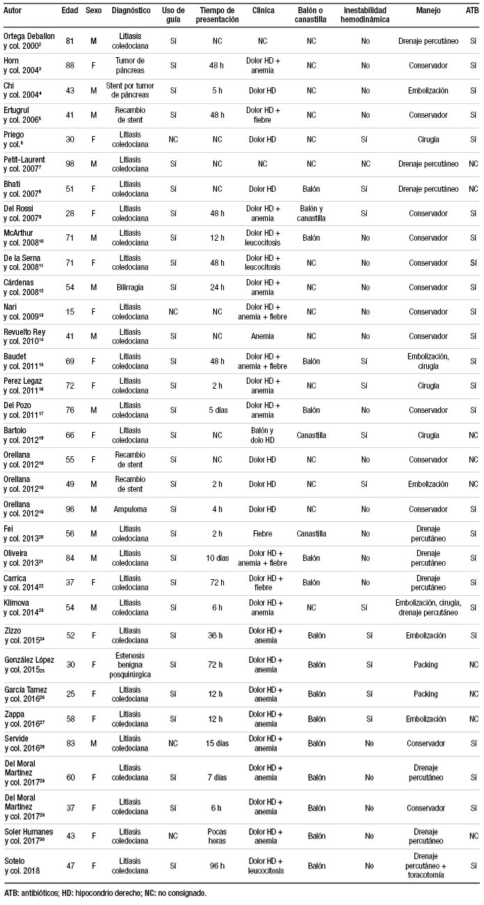 Dentro de las complicaciones de la CPRE, el hematoma hepático es raro y, desde el primer caso comunicado en el año 2000, solo hemos hallado 32 en nuestra revisión de la literatura. En la Tabla 1 resumimos los principales hallazgos de estas comunicaciones, comparándolos con los de nuestro caso.2-30