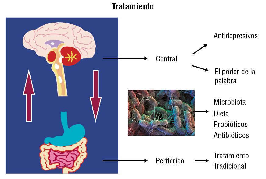 Resumen: El síndrome de intestino irritable (SII) es un trastorno funcional del aparato digestivo en el que el dolor abdominal recurrente se asocia con alteraciones en la defecación o cambios en el hábito evacuatorio. La falta de un esquema de eficacia óptima y la fisiopatogenia multifactorial son algunas de las razones por las que se ha intentado tratar esta condición con intervenciones que van desde modificaciones de la dieta hasta psicoterapia. La etiopatogenia del SII y de los trastornos funcionales gastrointestinales es consecuencia de una concatenación de factores que incluyen alteraciones de motilidad, hipersensibilidad visceral, liberación de mediadores de inflamación, interacciones del eje cerebro-intestino, factores psicosociales y alteraciones de la microbiota intestinal que se relacionan con sobrecrecimiento bacteriano del intestino delgado (SIBO) y disbiosis del colon. Partiendo de este modelo multifactorial se plantea un tratamiento en tres niveles: enfoque tradicional o periférico que busca solucionar el síntoma principal, enfoque central con la utilización de psicofármacos y/o terapias psicológicas, y modulación de la microbiota intestinal con dieta, prebióticos, probióticos y antibióticos.