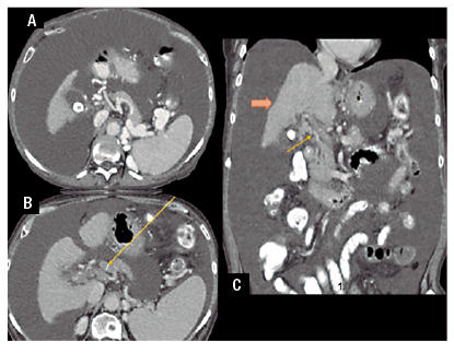 US Color Doppler and CT revealed portal, splenic and mesenteric thrombosis, therefore anticoagulation therapy was administered (Figure 1). The patient was on liver transplant waiting list: MELD classification: 13. Child Pugh B8.