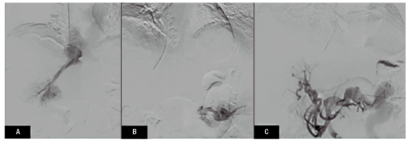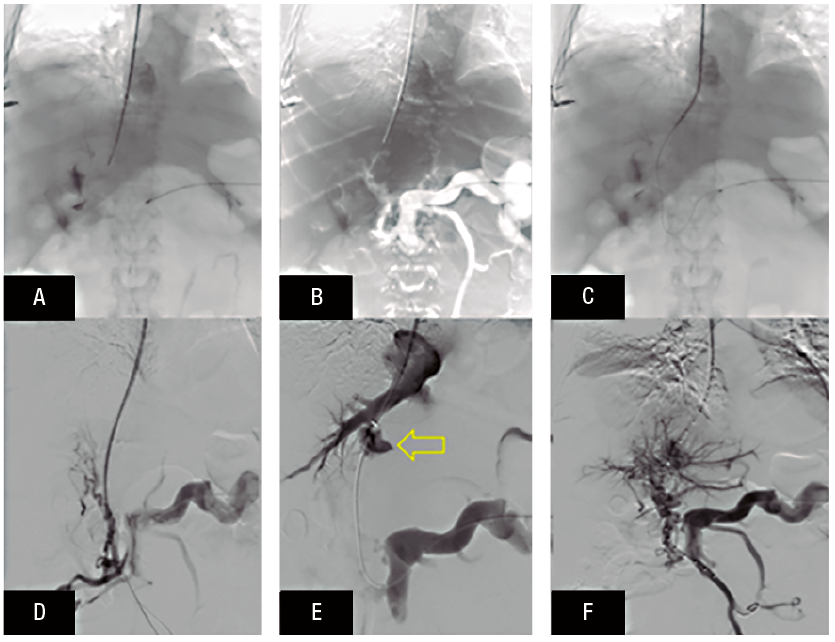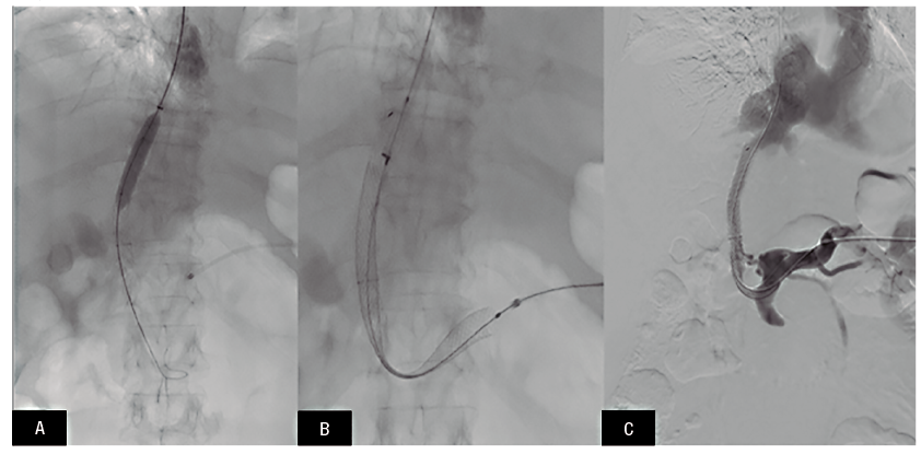 There were no major hemodynamic complications; however, we were cautious in our technique. In a previous study, Habib et al.7 successfully performed transsplenic PVR-TIPS in 11 patients with cirrhosis-induced chronic PVT. They concluded that, the ideal transsplenic PVR-TIPS candidate is one with main PVT with or without cavernomas. Furthermore, they emphasized the identification of SV access as the most crucial step of the procedure, arguing for US with possible correlation with magnetic resonance imaging. Likewise, our patient had main PVT, and we used US to ascertain SV access. Although the patient required revision of the TIPS, the procedure was uncomplicated. The TIPS remained patent through 2 months of follow-up, however, the patient presented heart failure and died.
