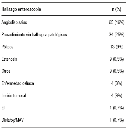 El rédito diagnóstico de la enteroscopía, definido como el hallazgo de lesión/lesiones significativas que pudieran explicar los síntomas que motivaron el estudio, fue del 70%, siendo el hallazgo más frecuente las angiodisplasias (n = 65, 45%, Figura 2). En la Tabla 2 se muestran los hallazgos de la enteroscopía.