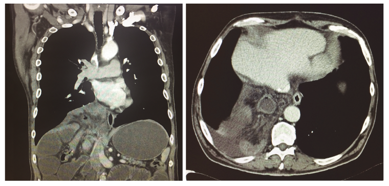 A los cinco meses de la intervención, el paciente acude a urgencias con un cuadro de dolor abdominal y vómitos de 72 horas de evolución, sin referir disnea ni otra sintomatología acompañante. En el momento de la exploración se encontraba hemodinámicamente estable y eupneico, con un abdomen doloroso y distendido, pero sin peritonismo. En urgencias se le realiza un análisis de sangre sin hallazgos a destacar, pero en la tomografía abdominal computarizada (TAC) de tórax/abdomen se observó una hernia diafragmática derecha con un estrangulamiento de las asas intestinales (Figuras 1 y 2).