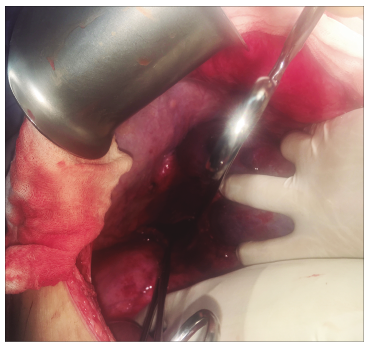 El paciente se intervino de forma urgente. Se evidenció una herniación de la anastomosis ileocólica previa con signos de sufrimiento. Se le realizó una laparotomía exploradora con la reparación del orificio mediante una sutura discontinua reabsorbible (Figura 3). El paciente fue dado de alta al quinto día postoperatorio sin incidencias y se encuentra en seguimiento en la actualidad.