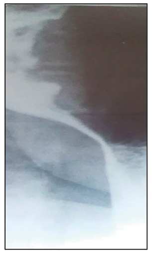 Mujer de 75 años de edad con antecedentes de extabaquista de dos paquetes al año, hipertensión arterial, dislipemia y enfermedad de Chagas, quien comenzó su enfermedad cinco meses antes de la consulta a nuestro hospital, con disfagia esofágica progresiva a sólidos y luego a líquidos. Presentó astenia, hiporexia y pérdida de peso de 13 kg, síntomas que la llevaron a necesitar ayuda en la mayoría de las actividades de la vida diaria, motivo por el cual se realizaron estudios en otra institución. En la seriada esofagogastroduodenal realizada al mes del inicio de los síntomas, se informó afinamiento del calibre en esófago inferior, con pasaje filiforme del medio de contraste (Figura 1).