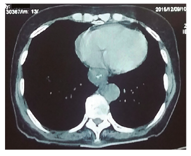 Se realizó entonces una videoendoscopía digestiva alta (VEDA) en la que se informó una lesión infiltrante en tercio inferior, que se franqueó con dificultad, sin compromiso gástrico, cuya biopsia informó un proceso inflamatorio sin atipia. Se le practicó también una tomografía computada con contraste oral en la que se observó engrosamiento concéntrico de la mucosa esofágica en el tercio inferior (Figura 2) y lesiones hipodensas en el parénquima hepático.