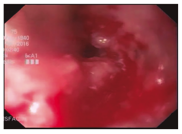 Ingresa por primera vez a nuestro hospital por hematemesis con descompensación hemodinámica. Al examen físico se constató hipotensión (80/60 mmHg), taquicardia (113 latidos por minuto), adelgazamiento, palidez, sin adenomegalias ni visceromegalias. Se solicitó laboratorio con los siguientes resultados: hematocrito 31%, urea 55 mg/dl, creatinina 0,5 mg/dl, plaquetas en valores normales, transaminasas y FAL elevadas al doble del valor normal y un tiempo de protrombina del 58%. Luego de la compensación hemodinámica con cristaloides se realizó una VEDA, en la que se observó desde los 32 a 35 cm de la arcada dentaria superior una lesión mamelonada, ulcerada, irregular, friable al roce del endoscopio, infranqueable, de la cual se tomaron biopsias (Figura 3).