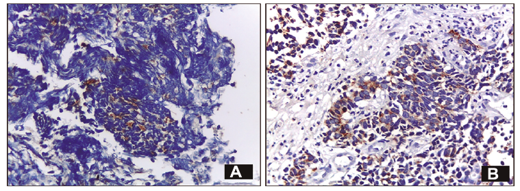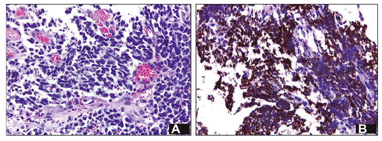 El informe histológico describió una proliferación de células neoplásicas pequeñas con moderado pleomorfismo nuclear y extensa necrosis, que resultaron positivas de manera focal con Citoqueratina AE1 AE3 y CD56 con alto índice de proliferación (aproximadamente 50%) evaluado con Ki 67 (Figuras 4 y 5).