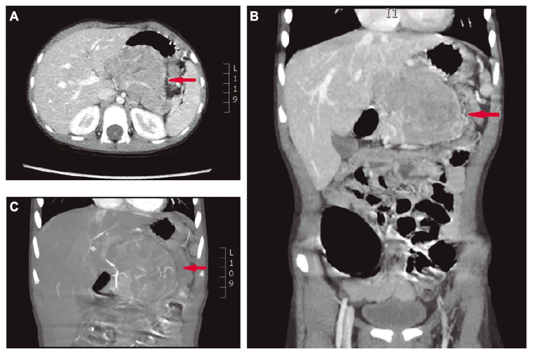 Due to the inability to assure a surgical complete resection, neo-adjuvant chemotherapy with cisplatin/doxorubicin was delivered, following SIOPEL 3 guidelines (Liver Tumor Strategy Group of the International Society of Pediatric Oncology). Post third cycle evaluation showed AFP 15ng/ml and CT-scan with very good partial response: tumor volume of 9.7 cm., superior mesenteric invasion and splenic veins compression (Figure 2). After 4th neo-adjuvant chemotherapy cycle, surgical resection was performed with free microscopic margins. Therapy was completed after two cycles of adjuvant chemotherapy without evidence of residual disease. A transitory elevation of AFP was seen after surgery. Currently free of disease +10 months’ post-diagnosis.