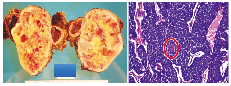 A distal pancreatectomy was performed and pathology analysis reported a Pancreatoblastoma, stage IIA (Figure 3).