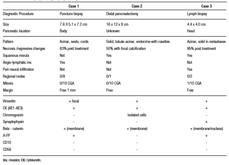 Approximately 90% shows acinar differentiation stained by immunohistochemistry of pancreatic enzymes such as trypsin, chymotrypsin, Alpha-1-antitrypsin or lipase. The epithelial components can be positive for A-FP associated with serum elevations. In two thirds of cases there may be endocrine differentiation with positive staining for chromogranin, synaptophysin, or specific-neuronal enolase.12 The nuclear or cytoplasmic Beta-catenin is especially observed in 80% of the squamous corpuscles and correlates with molecular alterations of the path of APC/beta-catenin in 40-60% of the sporadic PB13 and forms of congenital presentation (associated with Beckwith - Wiedemann syndrome and Familial Adenomatous Polyposis). 86% have alterations at chromosome 11p15.5.4, 13 These alterations are associated with other embryonic tumors such as hepatoblastoma, suggesting a common genetic origin. Pathologic findings of reported patients are shown in Table 1.