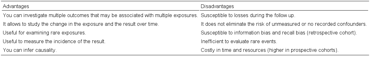 The objectives of the cohort studies include: knowing the aspects of the natural history or the clinical course of a disease or an event of interest, determining incidence rates and risks, identifying protective or risk factors for the development of a disease event. interest, study the survival, etc. The advantages and disadvantages of cohort studies can be seen in table 1.