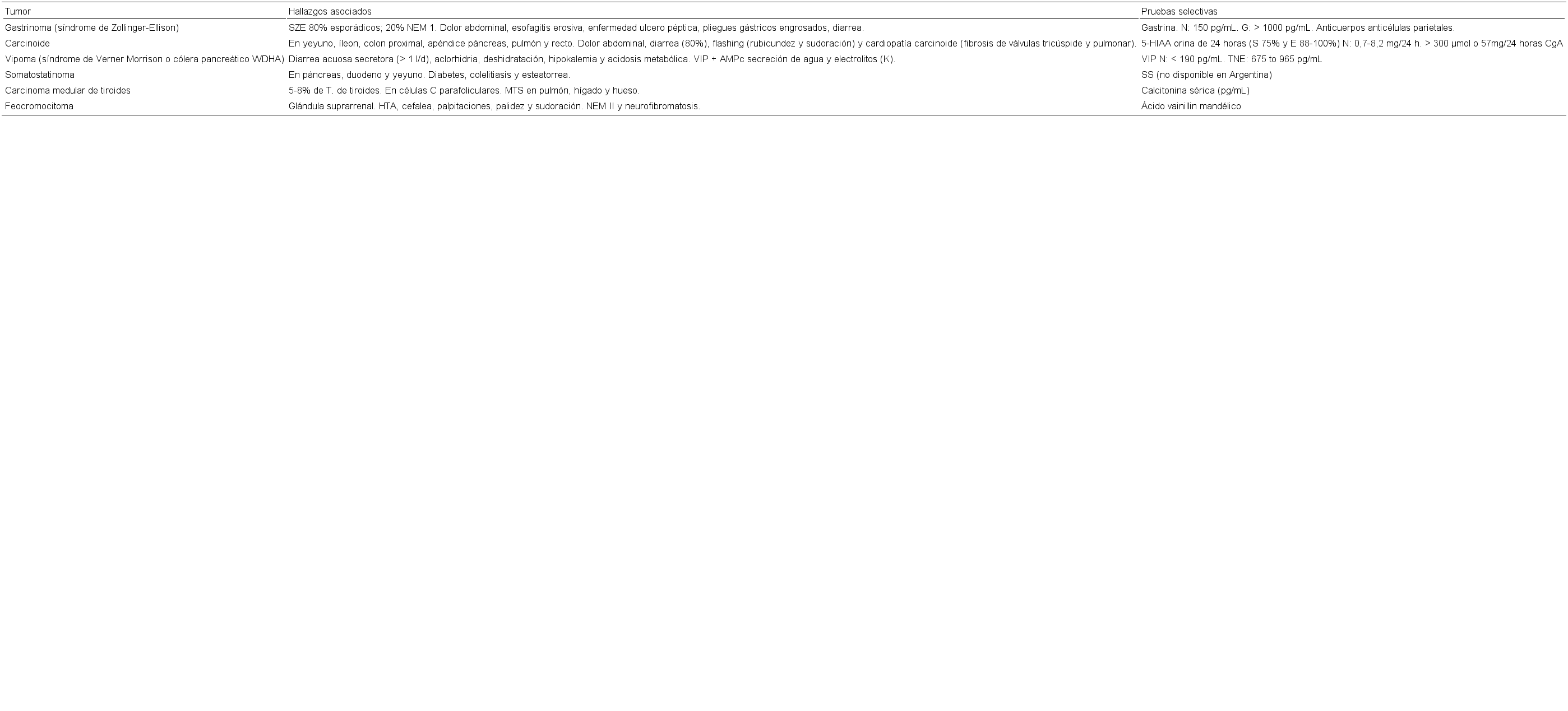 TNE: gastrinoma; vipoma; somatostatinoma; síndrome carcinoide, feocromocitoma, carcinoma medular de tiroides, síndrome de Zollinger-Ellison;