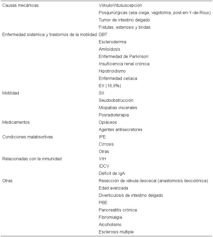 alteraciones de la motilidad: diarrea posvagotomía/ postsimpatectomía, neuropatía autónoma diabética, SII, alcoholismo;