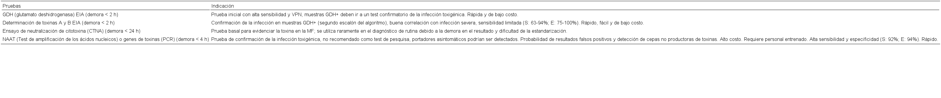 Estudio de la materia fecal: cálculo del anión gap (AG).Para discernir entre las diarreas osmóticas o las secretoras, se solicitará un ionograma fecal. Se calcula con la siguiente fórmula: 290 - [2 x (Na+ + K+) MF]. En la diarrea osmótica el AG será mayor a 125 mmol/L y en la secretora, menor de 50 mmol/L. Muchas veces los fenómenos que generan la diarrea son mixtos y los resultados serán sólo orientativos. Otros: volumen de materia fecal en 24 horas, pérdida de grasa (pruebas de Van de Kamer o esteatocrito) y clearance de α1 antitripsina (aumentado en enteropatía perdedora de proteínas, como en la EII, yeyunoileitis ulcerativa y linfangiectasia intestinal). La infección por Clostridium difficile debe sospecharse en los pacientes con antecedentes del uso de antibióticos, pero también en grupos de mayor riesgo (IRC, DBT, inmunosuprimidos, trasplantados, embarazadas y en recaída de pacientes con la EII). El diagnóstico se podrá realizar en dos etapas. El primer paso identifica la presencia del organismo con determinación de la enzima glutamato deshidrogenasa (GDH por método de EIA) o pruebas de amplificación de los ácidos nucleicos (PCR). La segunda etapa busca demostrar la producción activa de la toxina C. difficile (toxina A y B por método de EIA). Tal combinación, de una prueba sensible y luego una prueba específica, da altos valores predictivos negativos y positivos cuando las pruebas concuerdan. Determinación de pH fecal: la malabsorción de los carbohidratos resultará en un pH < 6, ya que a medida que los carbohidratos alcanzan el colon son fermentados por las bacterias, liberando ácidos grasos de cadena corta (AGCC) que acidifican las heces.1, 2