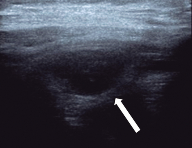 Ecografía del abdomen simple se evidencia al nivel de la fosa iliaca derecha adyacente al ciego una imagen líquida con contenido particulado de 27 mm en concordancia con la zona de dolor flecha