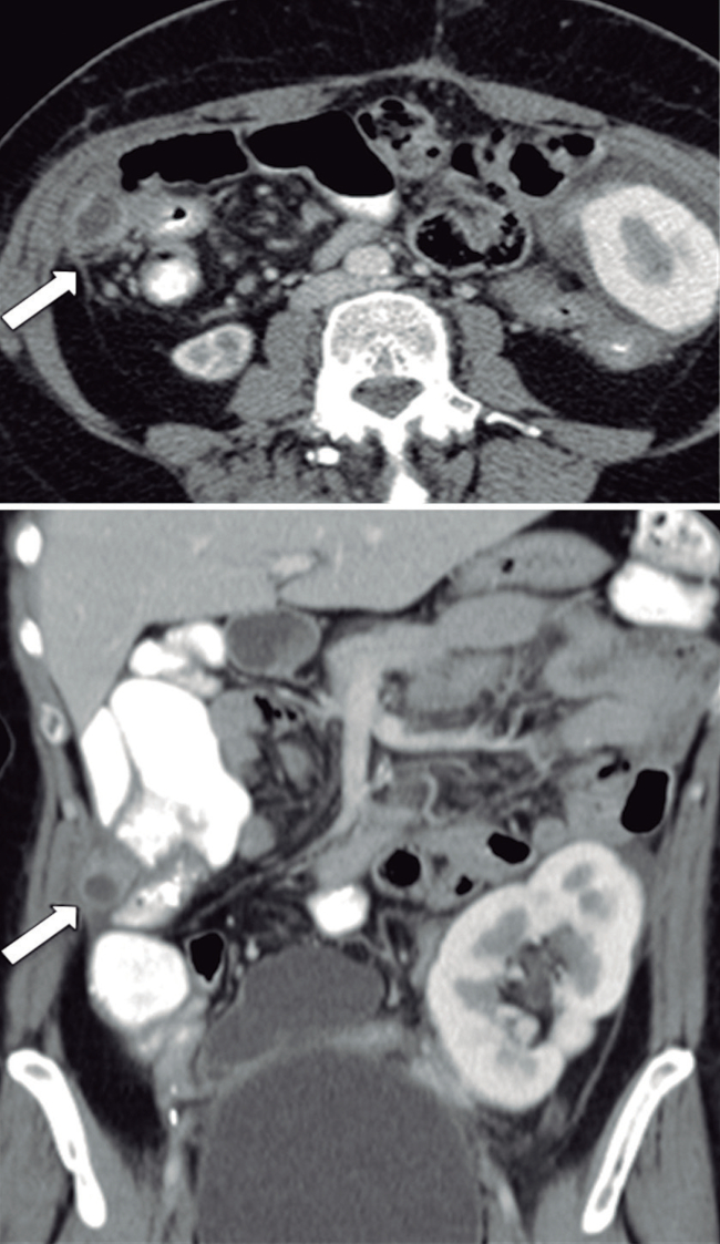 Una paciente de sexo femenino, de 47 años de edad, con antecedentes quirúrgicos de apendicetomía hace 2 años, ingresa a la institución con un cuadro clínico de una semana de evolución, caracterizado por un dolor al nivel de la fosa iliaca derecha no irradiado.