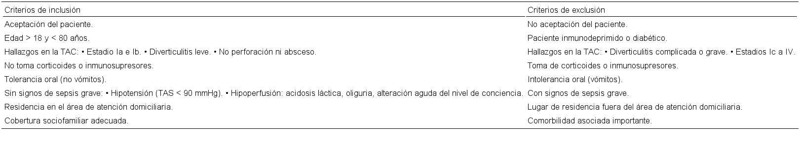 Ante la sospecha de una diverticulitis aguda (dolor en la fosa iliaca izquierda con signos locales de irritación peritoneal, asociado a malestar general y rectorragia o estreñimiento), en el servicio de urgencias se le realiza a cada paciente una tomografía axial computarizada (TAC) abdominal con contraste oral e intravenoso y analítica urgente incluyendo bioquímica, hemograma, estudio de coagulación PCR y hemocultivos en caso de fiebre alta (temperatura axilar superior a 38,5 ºC). De acuerdo con la guía clínica de cirugía colorrectal de la Asociación Española de Cirujanos, consideramos diverticulitis aguda no complicada a aquella que no asocie sepsis generalizada, absceso, fistula, oclusión intestinal o una perforación libre. Se utilizó la clasificación de Ambrosetti/ Doringer-Neff10 para valorar la gravedad y los criterios del American College of Chest Physicians y de la Society of Critical Care Medicine11 para la presencia de sepsis. Se consideraron criterios de inclusión y exclusión para el tratamiento ambulatorio de la diverticulitis aguda los reflejados en la tabla 1.
