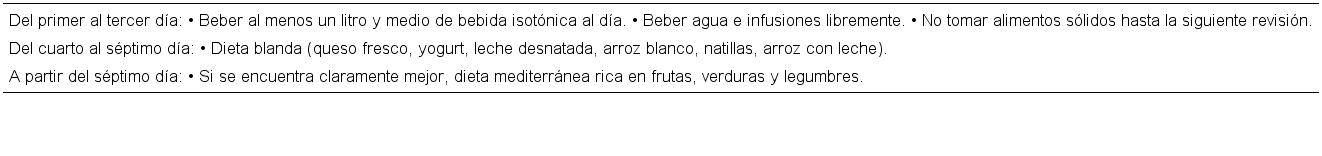 El paciente que cumplía los criterios de inclusión del protocolo recibía indicaciones para el tratamiento dietético y antibiótico domiciliario. Se garantizó una correcta administración del fármaco vía oral durante el tiempo previsto dado que debían presentar una correcta tolerancia oral y un entorno familiar favorable para ser incluidos en este protocolo de tratamiento. Los pacientes recibieron 1 dosis cada 8 horas de amoxicilina ácido clavulánico (875/125 mg) durante 7 a 10 días. Los pacientes alérgicos a penicilinas recibieron ciprofloxacino 500 mg cada 12 horas y metronidazol 500 mg cada 8 horas durante 7 a 10 días. Las recomendaciones dietéticas se incluyen en la tabla 2. Se consideró un fracaso del tratamiento ambulatorio la necesidad de ingreso hospitalario para la administración intravenosa del antibiótico o analgesia, así como la necesidad de cirugía urgente.