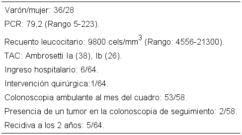 Los 58 pacientes que no precisaron ingreso hospitalario durante el seguimiento ambulatorio fueron evaluados en una consulta al mes del inicio del cuadro, realizándose una exploración clínica, analítica, colonoscopia y la TAC. En 5 (5/58) de los pacientes no se realizó la colonoscopia al mes por mala preparación (puntuación en escala de Boston inferior a 6), realizándose en las 4 semanas siguientes. En el estudio realizado tras la resolución del cuadro agudo, en dos pacientes (2/58) se detectó un adenocarcinoma de colon, por lo que precisaron una sigmoidectomía programada (estadios tumorales T3N0 y T4N1 en el estudio final de anatomía patológica).